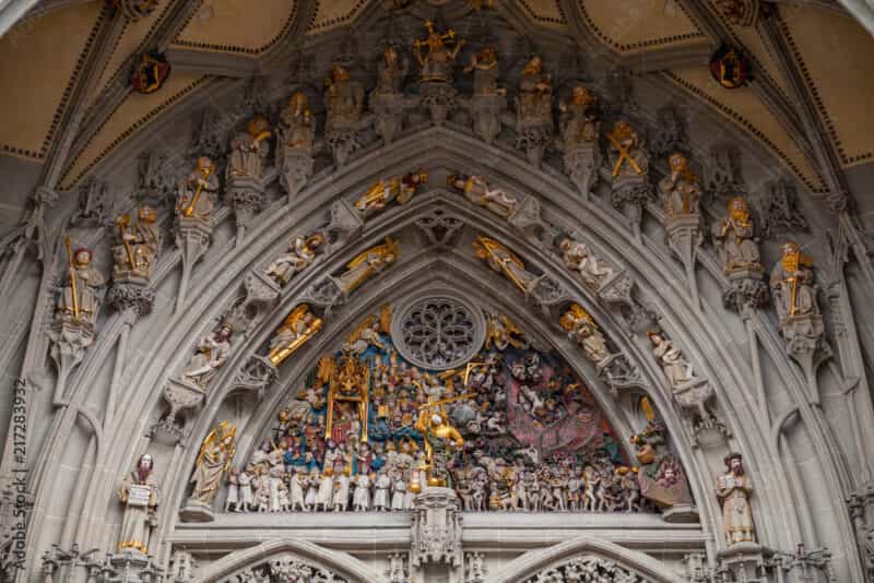 さらに、この大聖堂の正面入り口には、彫刻家エアハルト・キュングによって作られた234体の像が表現する「最後の審判」があります。向かって左側には、神に選ばれ天国へ向かうもの、右側には地獄へ行き、永遠の苦しみを味わうものが表現されています。